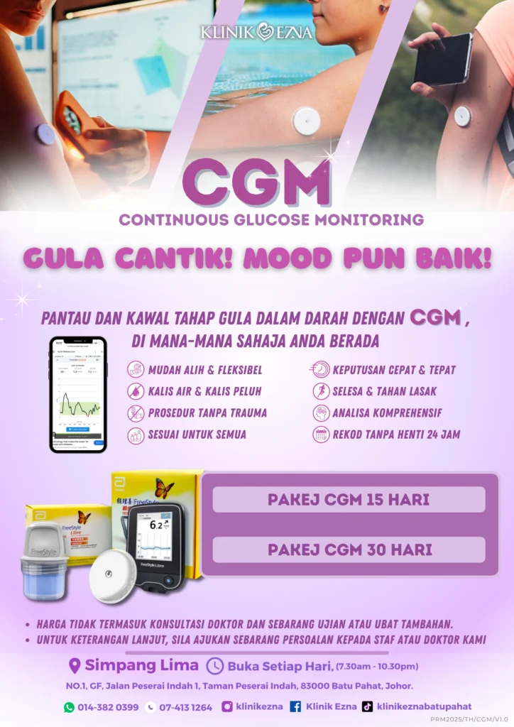 Klinik Ezna menawarkan Continuous Glucose Monitoring (CGM) untuk memantau dan mengawal tahap gula dalam darah secara mudah alih di mana sahaja anda berada. CGM ini kalis air, kalis peluh, selesa, tahan lasak dan memberikan keputusan cepat serta tepat. Prosedurnya tanpa trauma, sesuai untuk semua, dengan analisa komprehensif dan rekod berterusan 24 jam. Pilihan pakej tersedia untuk 15 hari atau 30 hari.